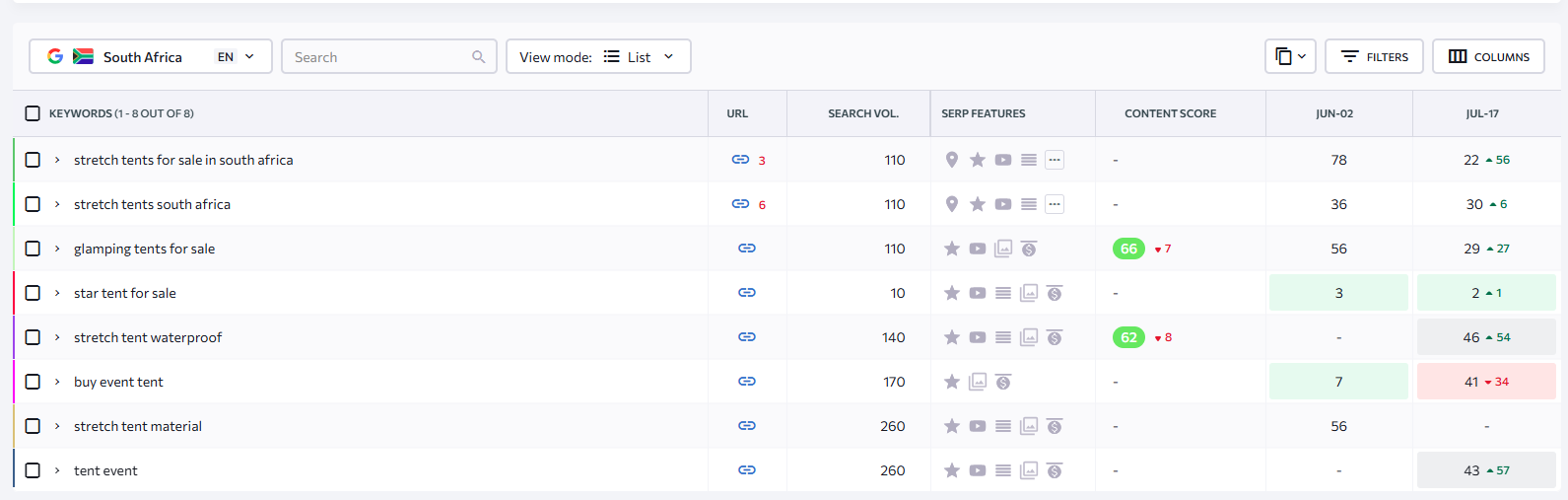 Each core product was matched to search clusters like “stretch tents for sale South Africa,” “buy a tent SA,” “glamping tents for events,” etc. This enabled us to build search-specific pages that aligned with user intent and improved click-through rates.
